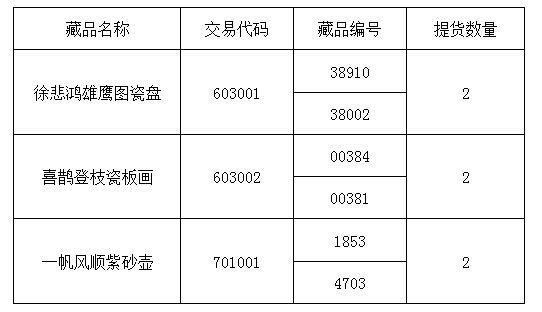 應投資人會員申請,經本交易所對申請人信息核實以及出庫藏品復驗后,提貨藏品已完成發貨,提醒廣大投資者注意盤面藏品數量變化。提貨藏品信息如下: